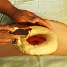 In this, a small compartment or cabin is constructed around the navel with wet flour of black gram (as in Kati Vasti or Janu Vasti). This gives space to pool oils or juices or decoctions prepared from herbs.